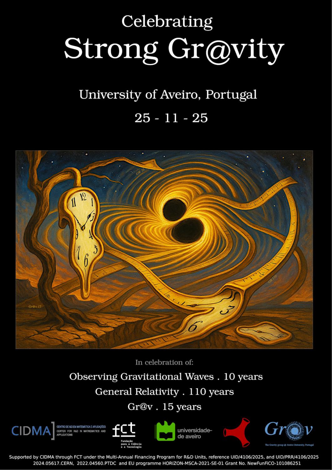 On November 25, 1915, Einstein presented the field equations of General Relativity to the Prussian Academy of Sciences. A hundred and ten years later, we celebrate the remarkable progress of the field of strong gravity — its many achievements, the 15th anniversary of the Aveiro Gr@v group (est. 2010), and a decade since the first detection of gravitational waves. Click here for more details.